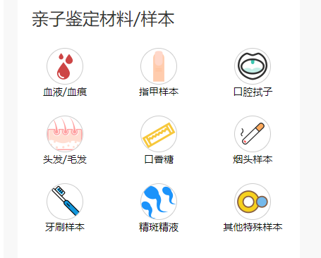 常規(guī)樣本:血痕、頭發(fā)、口腔棉簽;特殊類樣本:煙頭、體毛、指甲、牙刷、口香糖、吸管、紙杯口、瓶口瓶蓋、肌內(nèi)組織、臘塊、口水等一切帶人體細(xì)胞的物件;有關(guān)樣本如何采集、保存、郵寄的,可咨詢親子鑒定中心的采樣員(15024490393)