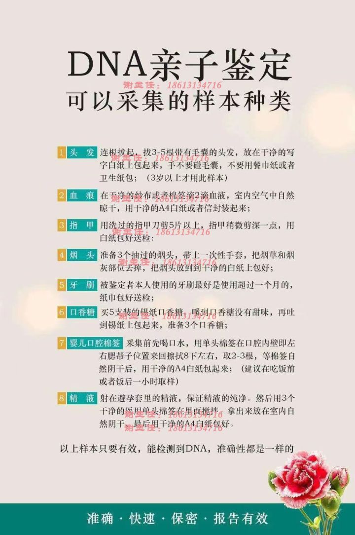 2.如果不方便到現(xiàn)場采樣,自己采樣后快遞到鑒定機構,可以按照親子鑒定的樣本采集方式,自抽樣后簡單填寫聯(lián)系方式,快遞到鑒定單位。如果第一次送檢的樣品不合格,可以再次免費補常規(guī)樣品進行檢測。常規(guī)親子鑒定樣本具體指血液樣本(血痕和血斑)、口腔拭子和帶有毛囊的頭發(fā),特殊樣本,指甲、牙刷、精液,煙頭等等。